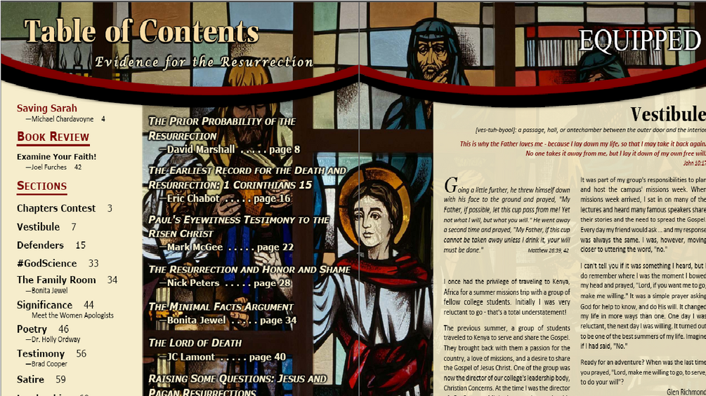Equipped was a periodical of the Christian Apologetics Alliance including commentary and scholarship from a Christian perspective. The third issue of that periodical covered the topic of the resurrection of Jesus Christ. The articles in this document include the following: